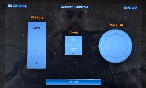 To switch which camera to use, on the touch panel tap on Room Camera Controls. Select from three cameras in the space. It will take a few second for the camera feed to switch