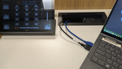 Start by connecting your laptop to the HDMI and USB cables in the podium