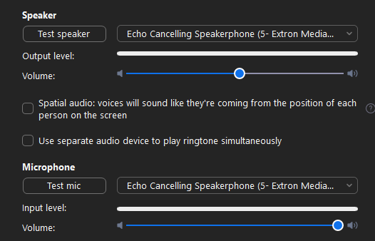 For the Audio settings, make sure the microphone and speakers are set to Echo Cancelling Speakerphone(5-Extron Media.)