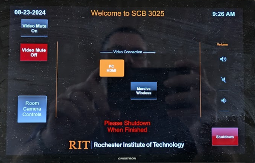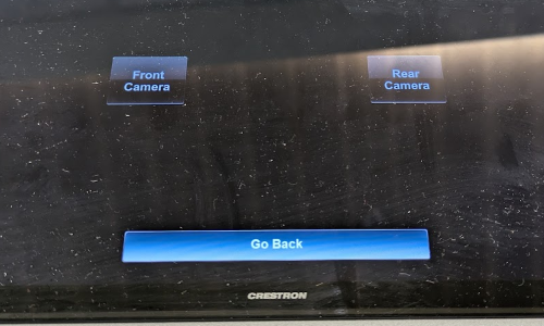 To switch which camera to use, on the touch panel tap on Room Camera Controls. Select from Front Camera or Rear Camera. It will take a few seconds for the camera feed to switch.