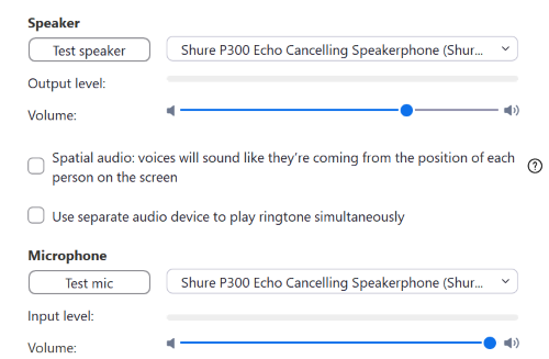 For the audio settings make sure the microphone and speakers are set to Shure P300 Echo Cancelling Speakerphone.