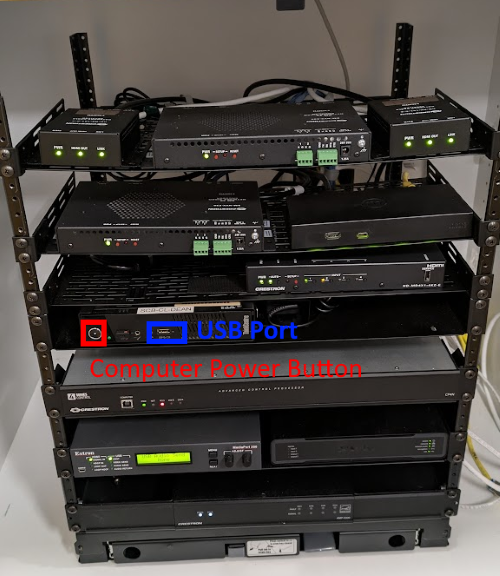 Start the projection system by using the touch panel on the cabinet on the south wall.